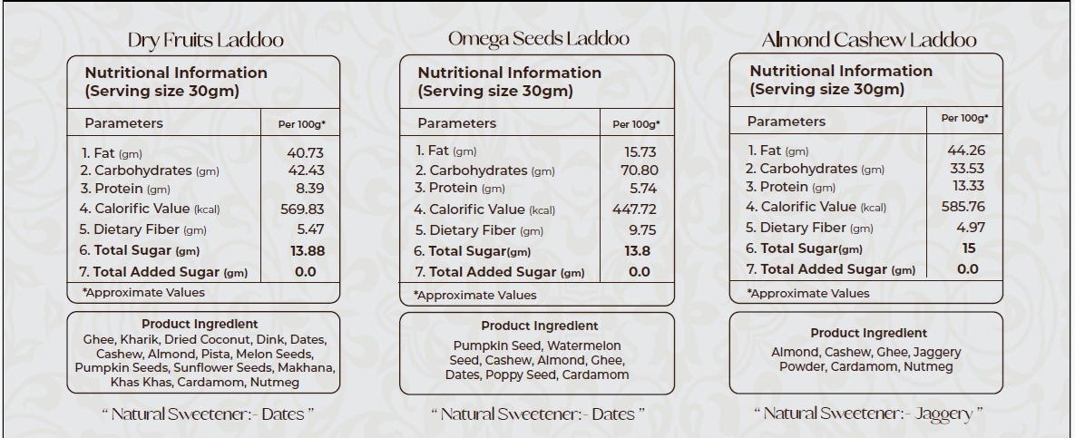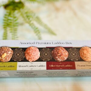 Power pack combination of Dry fruits, Omega seeds, Almond cashew, Millet Marvel, Peanut Power and Besan Bliss laddoosAssorted Premium Laddoo Box